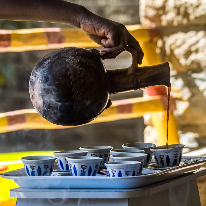 The elaborate Ethiopian coffee ceremony uses a special ceramic pot/decanter called a jebena and small handle-less cups. Such reverence for coffee has affected Ethiopian culture as a whole.